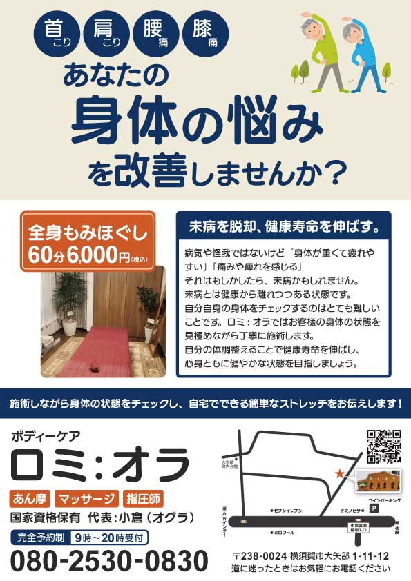 使用用途 チラシ(配布、設置用) 使用ツール Illustrator/Photoshop ターゲット 50代以上の身体に不調がある男女 デザインの説明 ご年配の方にも読みやすいように、フォント・サイズ・配色を選びデザインしました。 使用用途 使用ツール ターゲット デザインの説明 チラシ(配布、設置) Illustrator/Photoshop 50代以上の身体に不調がある男女 ご年配の方にも読みやすいように、フォント・サイズ・配色を選びデザインしました。 Banner LP Flyer Website Banner LP Flyer Website
